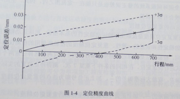 視機床規格選擇20mm, 50mm?;?00mm的間距,用數據輸入法做正向和反向快速定位,側出實際值和指令值的偏差.為了反映多次定位中的全部誤差,國際標準化組織規定每一個定位點進行5次數據測量,計算出均方根值和平均偏差±3歐。定位精度是一條由各定位點平均值連貫起來有平均偏差土3歐構成的定位點離散誤差帶,如圖1-4所示。