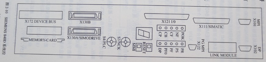 NCU控制板是系統的控制核心,系統CPU就在這個控制板上,除此之外,控制板上面還多接口、指示燈、按鈕和設定開關,圖2-10為SIEMENS 840D系統控制板的正面示意圖。
